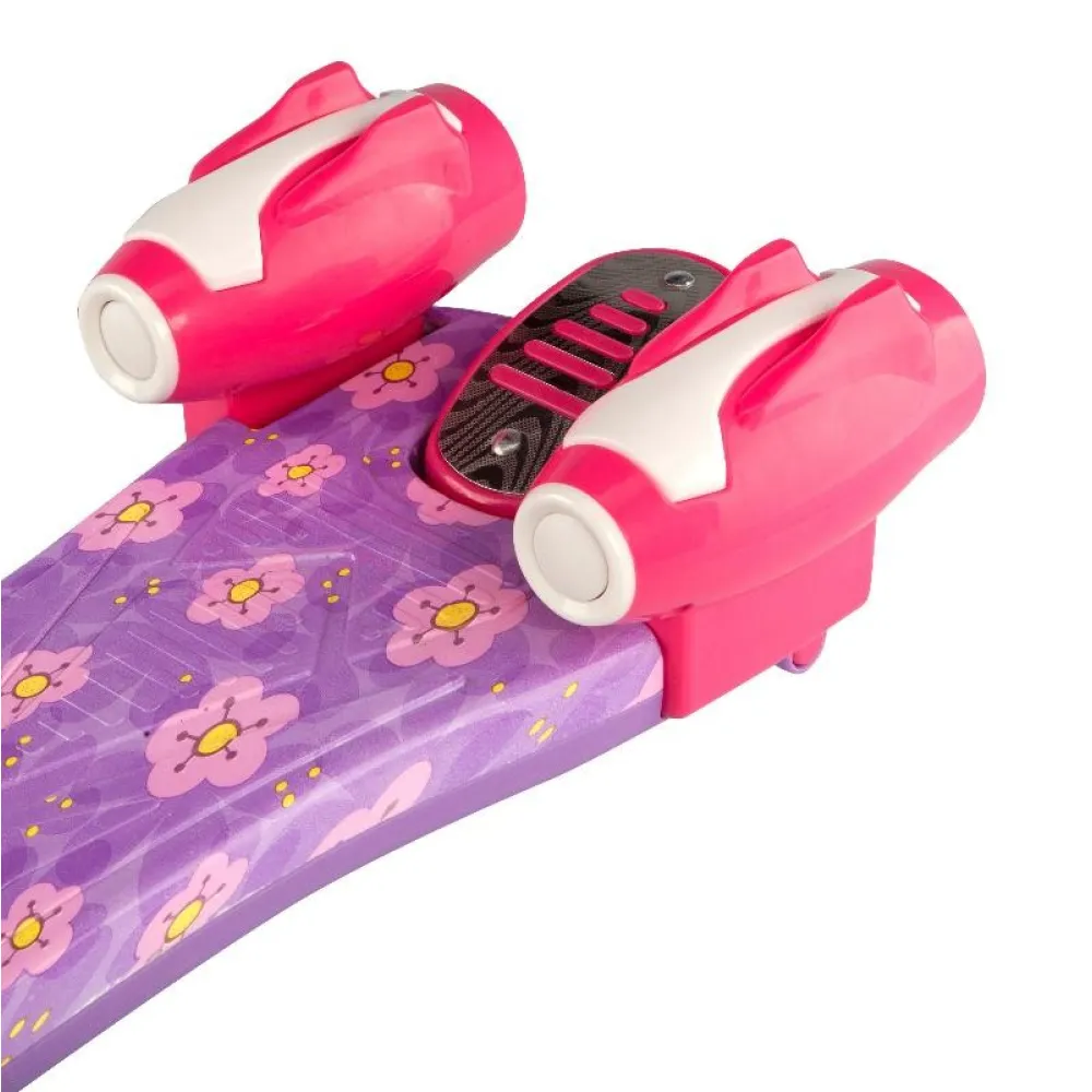 Главная особенность самоката - две турбины, расположенные в задней части деки, - они создают эффект вырывающегося пламени и дыма, как будто вы управляете космическим кораблем! Важно отметить, что такой эффект совершенно безопасен и не принесет вреда окружающим или самому ребенку. Дело заключается в паре, который образовывается из залитой внутрь жидкости, а за счет подсветки зрительно кажется, что он идет от «огня».